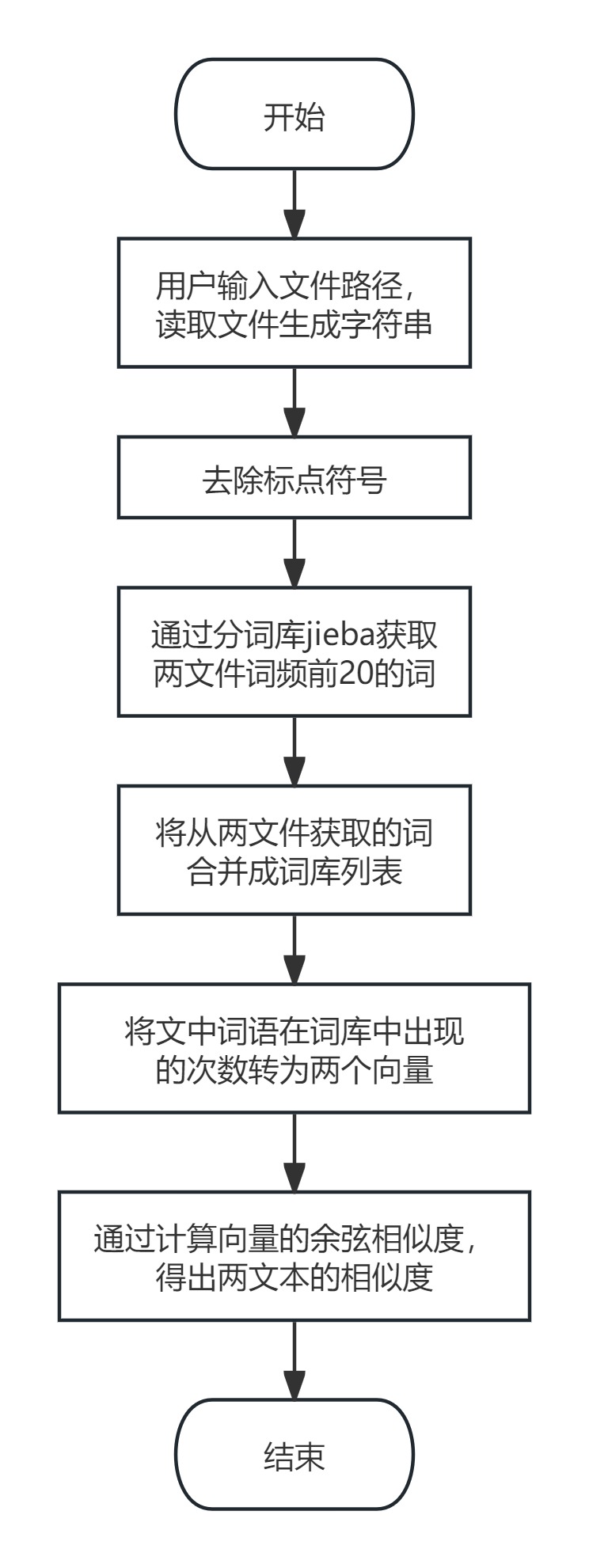 4.text_checking:核心查重函数,分别调用文件读取(read_file)、文本预处理(long_text_preprocess),然后构建词频向量并计算余弦相似度。最后输出相似度结果到指定文件。