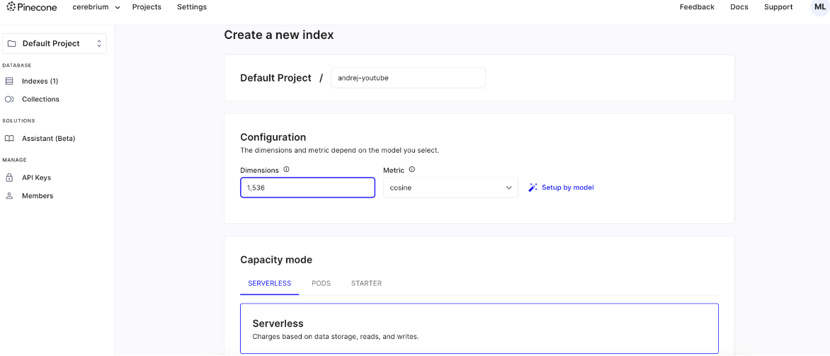 为简单起见,我们将使用 OpenAI 进行嵌入,并使用 Pinecone 作为我们的向量存储。Pinecone数据库是一个专为大规模向量集的高效索引和检索而设计的实时、高性能向量数据库。 您可以在此处注册 OpenAI 账户,在此处注册 PineCone 账户。我们将使用 Langchain 框架来创建我们的 RAG 应用程序,因此我们也将使用它来分块、上传、嵌入和存储我们的转录文本。您需要在 Pinecone 中创建一个索引,我们将把嵌入式数据上传到该索引中。由于我们使用的是 OpenAI 嵌入模型,因此必须将维度设置为 1536,而且我们将使用余弦指标来衡量相似性。