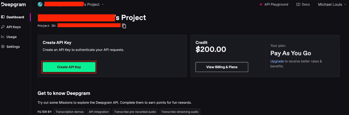 我们使用 Deegram API 完成这项工作。您可以在这里注册 Deepgram 账户(他们提供丰厚的免费级别)。然后,你可以在初始界面创建一个 API 密钥。运行 pip install deepgram httpx。在项目根目录下创建 .env 文件,并添加 API 密钥,我们将其命名为 DEEPGRAM_API_KEY