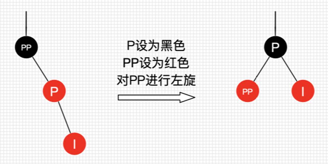 把PP结点设为红色了,如果PP的父结点是黑色,那么无需再做任何处理;但如果PP的父结点是红色,根据性质4(每个红色结点的两个子结点一定都是黑色。),此时红黑树已不平衡了,所以还需要把PP当作新的插入结点,继续做插入操作自平衡处理,直到平衡为止。