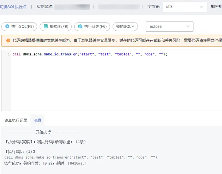 CALL dbms_schs.make_io_transfer(“start”, “库名”, “表名”, “分区名”, “”, “obs”);