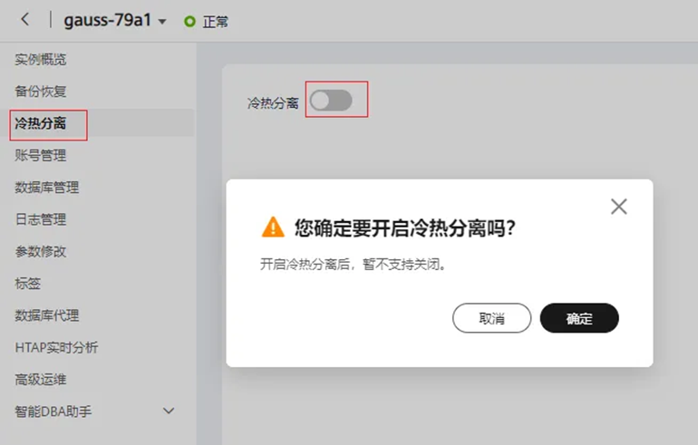 登录管理控制台,在云数据库 GaussDB(for MySQL)的“实例管理”页面,单击目标实例名称,进入基本信息页面。在左侧导航栏,点击“冷热分离”,在“冷热分离”右侧点击图片,在弹框中点击“确定”,打开冷热分离开关。