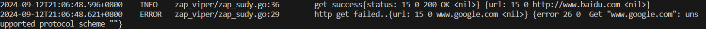 而初始化logger调用的函数可以通过调用zap.NewProduction()/zap.NewDevelopment()或者zap.Example()创建一个Logger。区别就是一个是以json的格式返回,一个是以终端标准输出带有空格返回。
