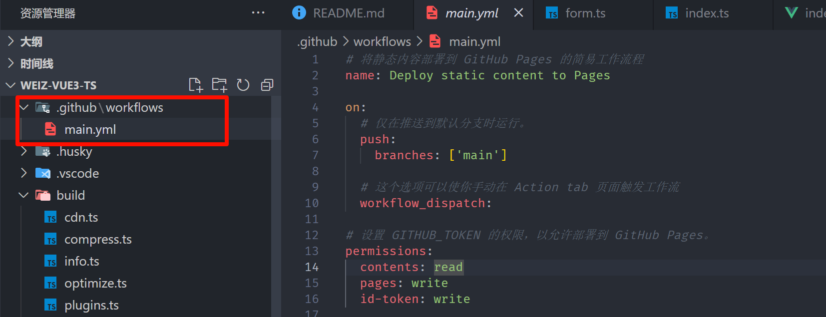 根目录下新建 .github 文件夹,然后在其目录下新建 workflows 文件夹,在里面新建 main.yml 。