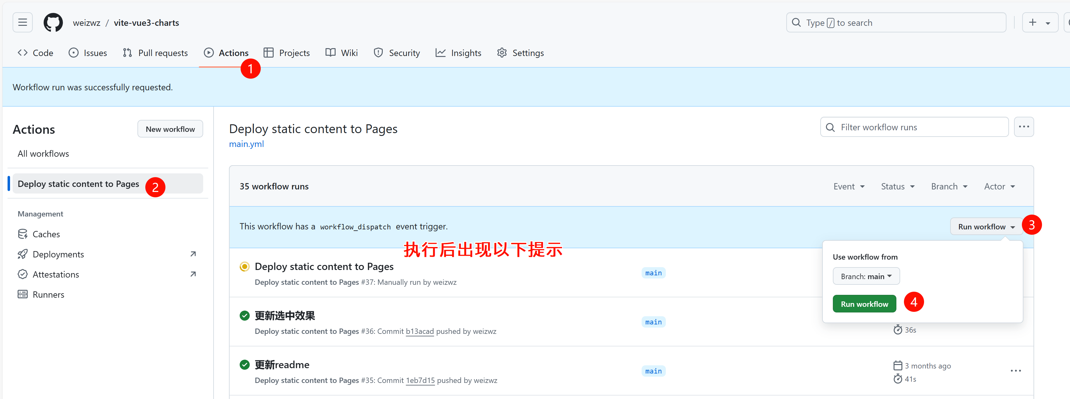 或者到GitHub网站仓库目录,在 Actions 页签中,手动部署