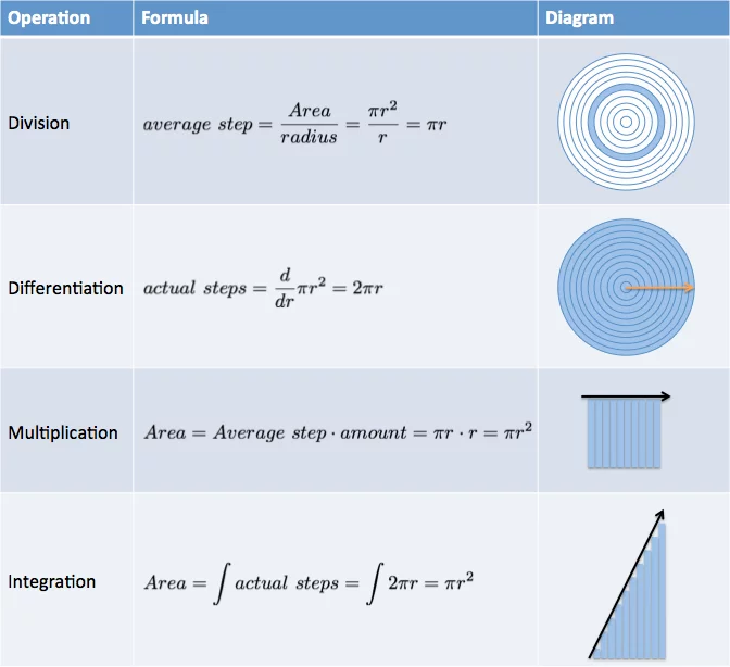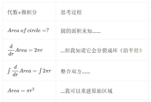 微积分在代数的基础上又增加了两种运算:积分和导数。现在,我们可以用代数的方法计算圆的面积了:
