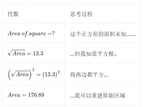 代数让我们从一个事实出发,系统地推导出其他事实。想象一下,我想知道一个未知正方形的面积。我无法测量面积,但我无意中听到有人说它的边长是 13.3 英寸。