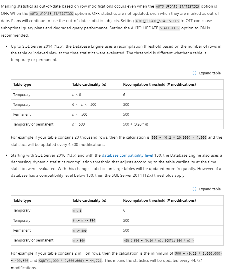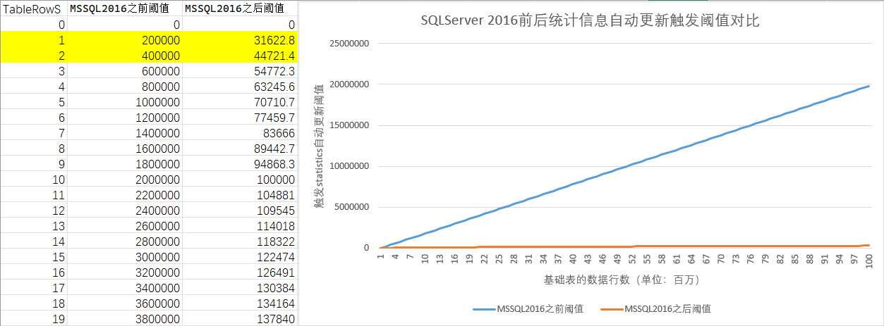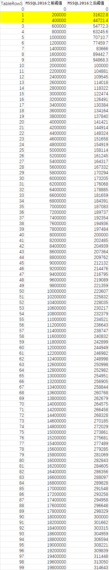 最显著的变化,在SQLServer 2016之后,表行数大于500之后:MIN ( 500 + (0.20 * n), SQRT(1,000 * n) )