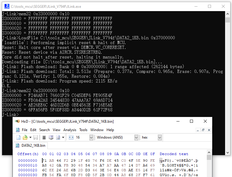 先在 JLink 命令行下用 LoadFile 命令做测试,该命令支持所有主流格式的程序文件。为了方便设定下载起始地址,我们就用 .bin 格式做测试。