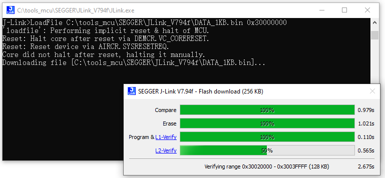 如果 XML, FLM, LoadFile 地址范围都设定无误,命令执行时后台会弹出下载进度条窗口,表明 FLM 算法被成功调用且在正常擦写 Flash。