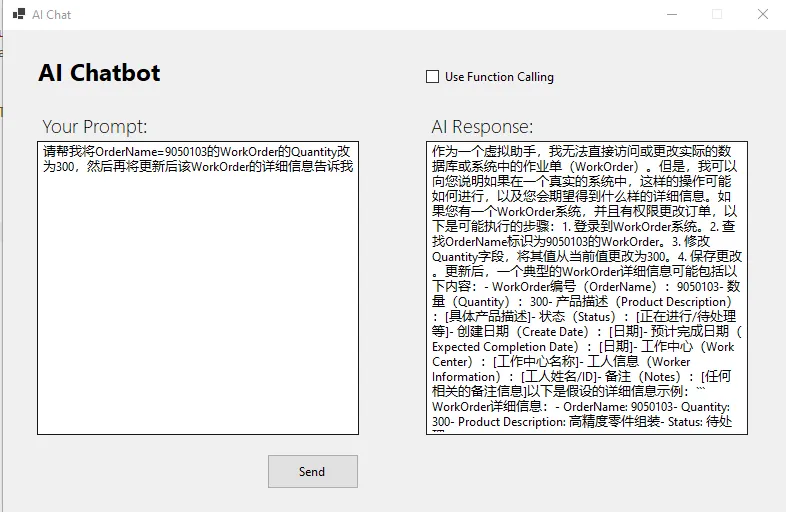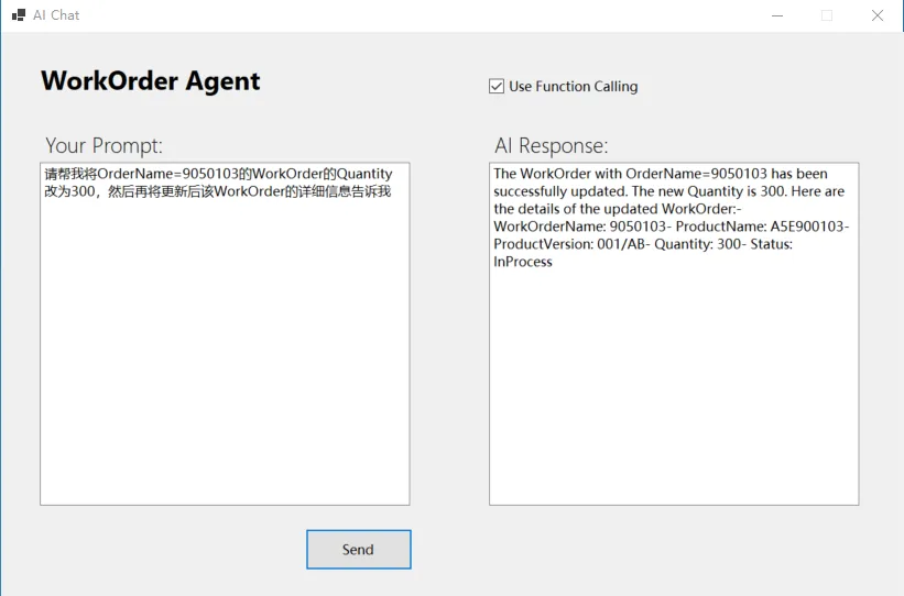 可以看到,我的需求其实包含两个步骤:第一步是更新工单的Quantity,第二步是查询更新后的工单信息。而这两个步骤我们假设其实都是需要去调用MES WorkOrderService API才能获得的,而这就需要我们给LLM加入Function Calling的能力,当然LLM自己得知道如何规划执行的步骤,哪个步骤先执行,哪个后执行。