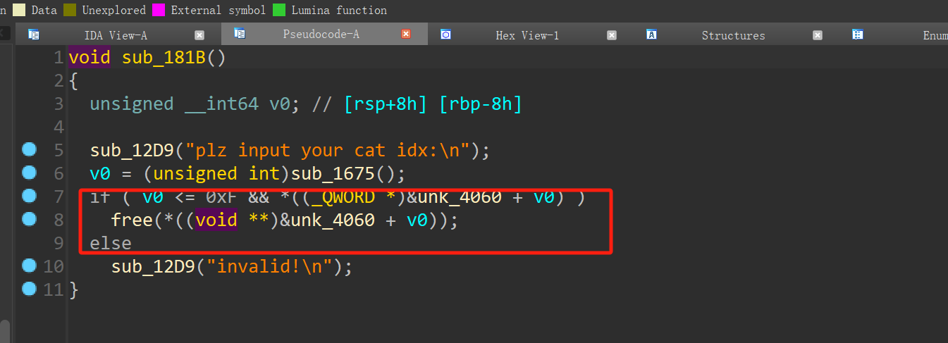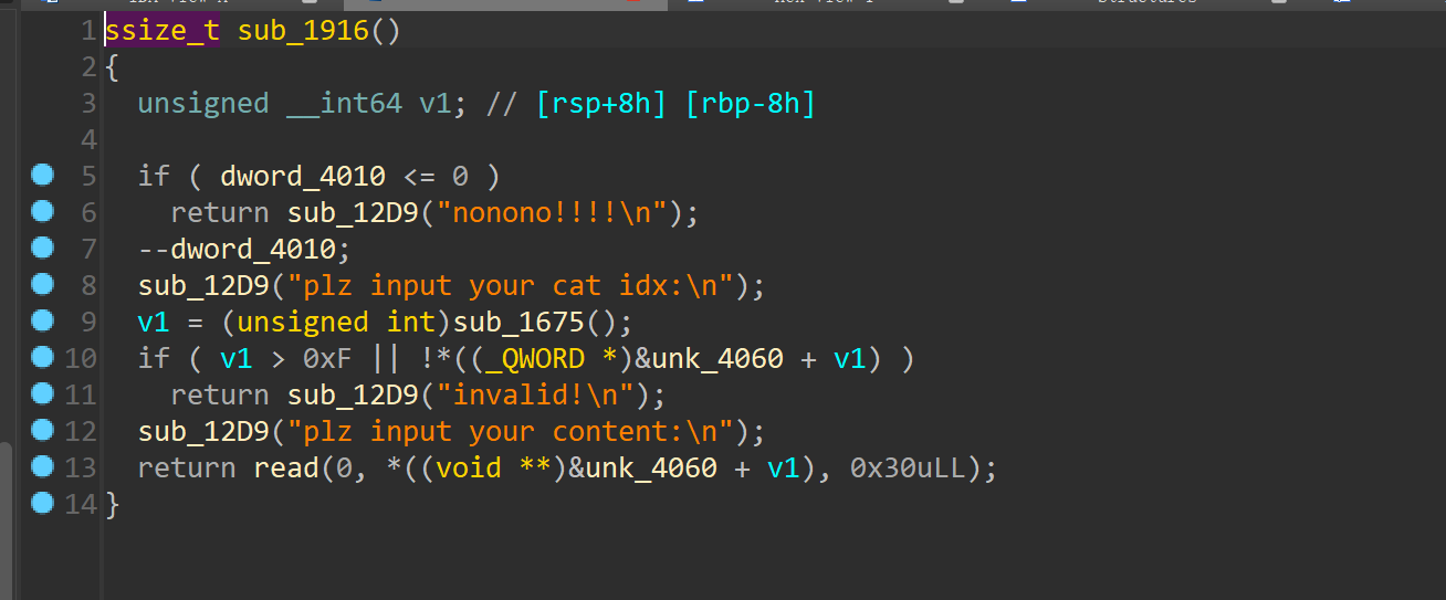 题目一上来是有检查的,但是我们重心放在house of cat ,这里检查直接给出