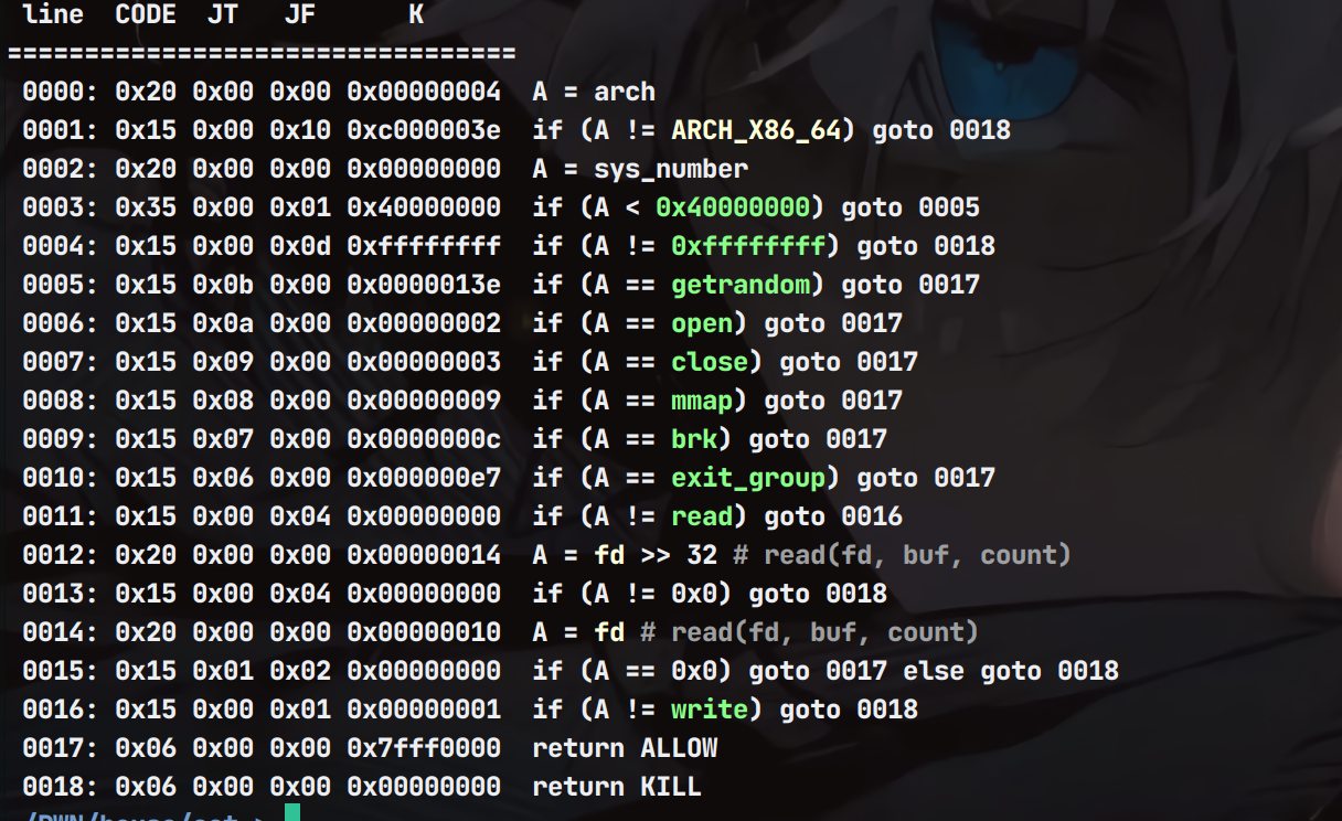 程序还开了沙箱只能orw,而且read的第一个参数必须是0,那么就是要先要关闭文件描述符0,然后再次使用read