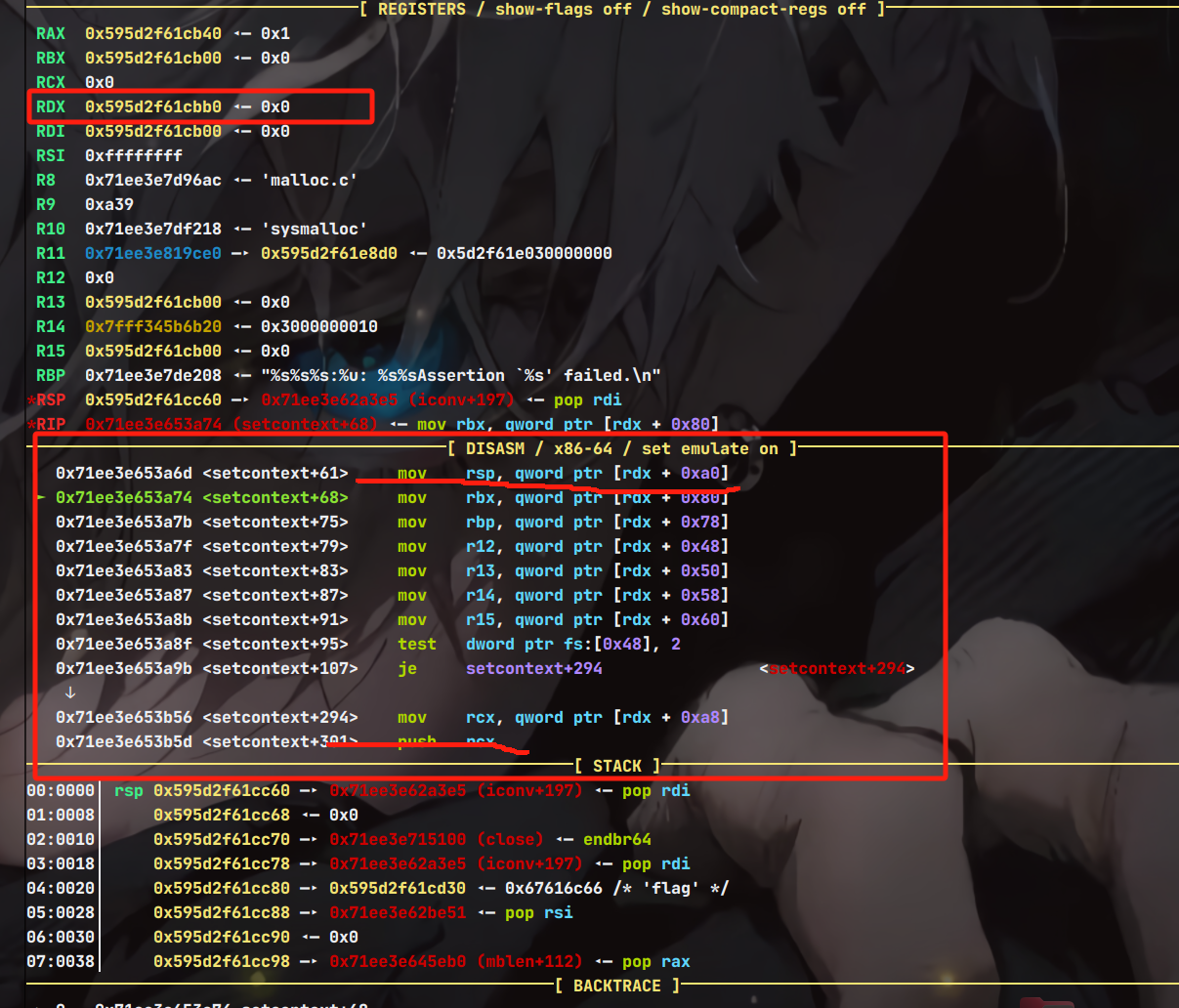 看看完整的调用链__malloc_assert-> __fxprintf->__vfxprintf->locked_vfxprintf->__vfprintf_internal->_IO_wfile_seekoff->_IO_switch_to_wget_mode->setcontext->orw****
