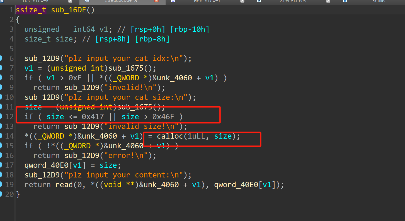 io.sendlineafter('plz input your cat size:',str(0x450))