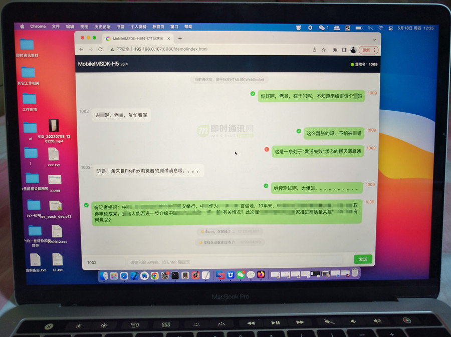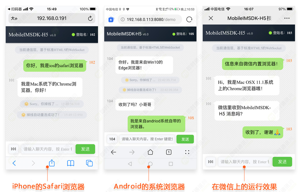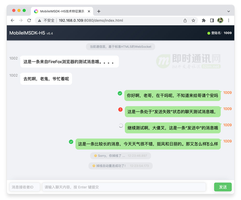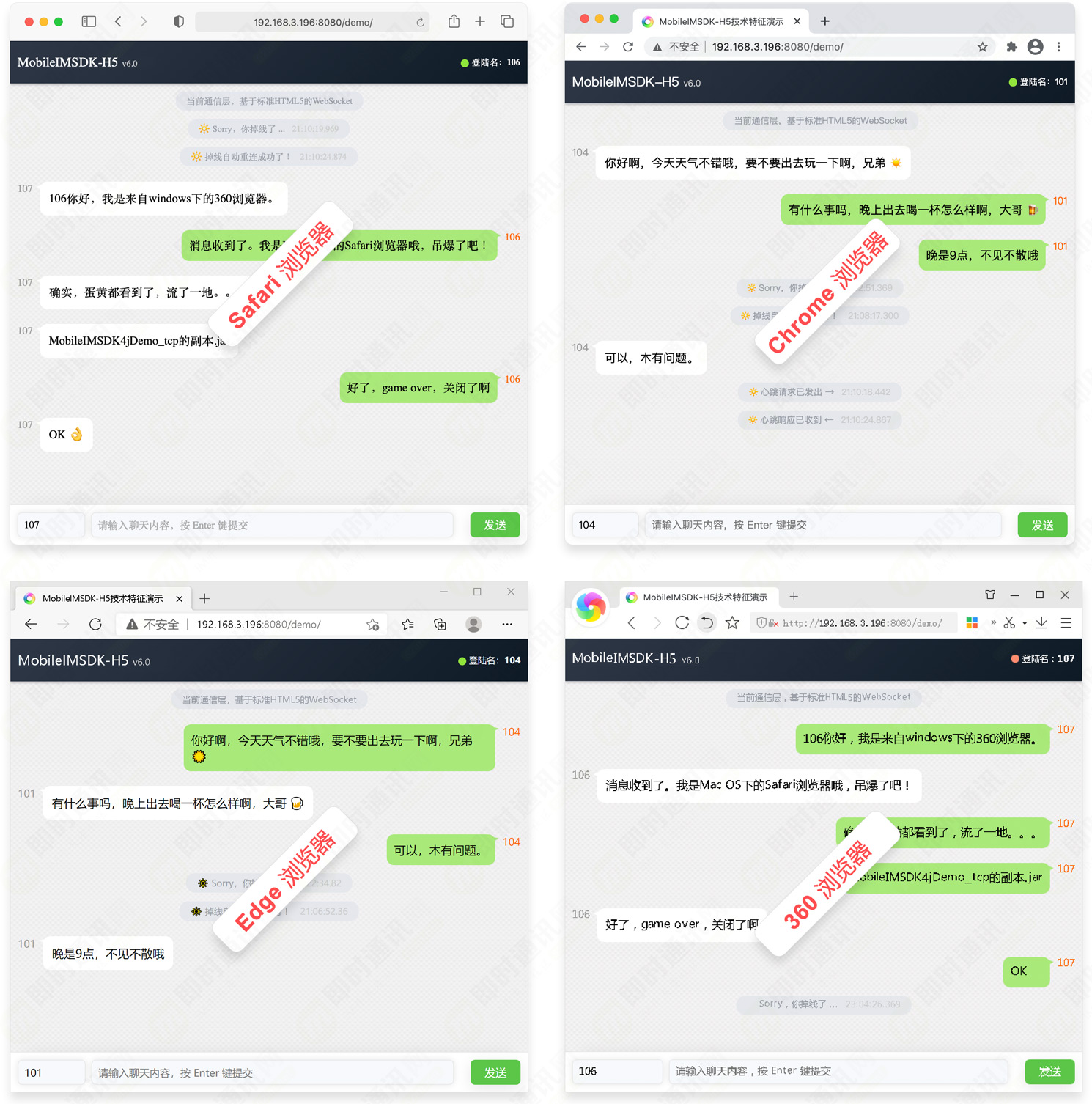 - 1)MobileIMSDK-Web可以兼容不支持HTML5的旧版浏览器或容器,而MobileIMSDK-H5端必须运行在当前主流的HTML5浏览器或容器;