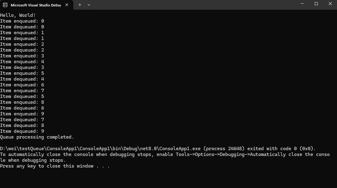 1 // See https://aka.ms/new-console-template for more information 2 using ConsoleApp1.Models; 3 4 Console.WriteLine("Hello, World!"); 5 var queue = new SimpleQueue<int>(); 6 7 // 创建生产者线程 8 Thread producer = new Thread(() => 9 { 10 for (int i = 0; i < 10; i++) 11 { 12 queue.Enqueue(i); 13 Thread.Sleep(100); // 模拟一些延迟 14 } 15 }); 16 17 // 创建消费者线程 18 Thread consumer = new Thread(() => 19 { 20 for (int i = 0; i < 10; i++) 21 { 22 if (!queue.IsEmpty()) 23 { 24 queue.Dequeue(); 25 } 26 Thread.Sleep(150); // 模拟一些延迟 27 } 28 }); 29 30 producer.Start(); 31 consumer.Start(); 32 33 producer.Join(); 34 consumer.Join(); 35 36 Console.WriteLine("Queue processing completed.");