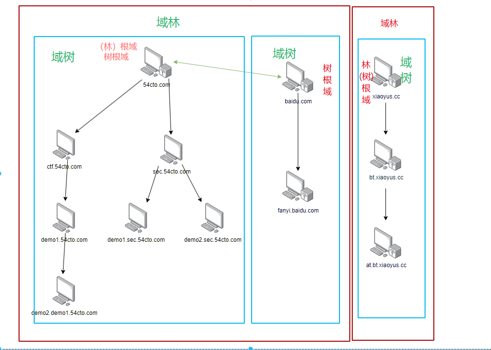 域森林指若干个域树通过建立信任关系组成的集合。可以通过域树之间建立的信任关系来管理和使用整个森林中的资源,从而又保持了原有域自身原有的特性。这里域树abc.com与域树abc.net之间通过建立信任关系来构成域森林。