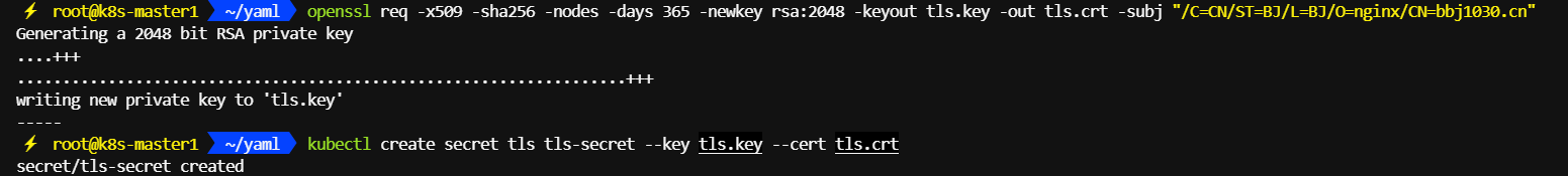 openssl req -x509 -sha256 -nodes -days 365 -newkey rsa:2048 -keyout tls.key -out tls.crt -subj "/C=CN/ST=BJ/L=BJ/O=nginx/CN=bbj1030.cn"