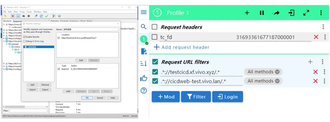 浏览器端或者 APP 端发起的 HTTP 请求,用户可以通过本地安装的代理工具拦截 HTTP 请求,再按规则配置注入 tc_fd 流量标识。