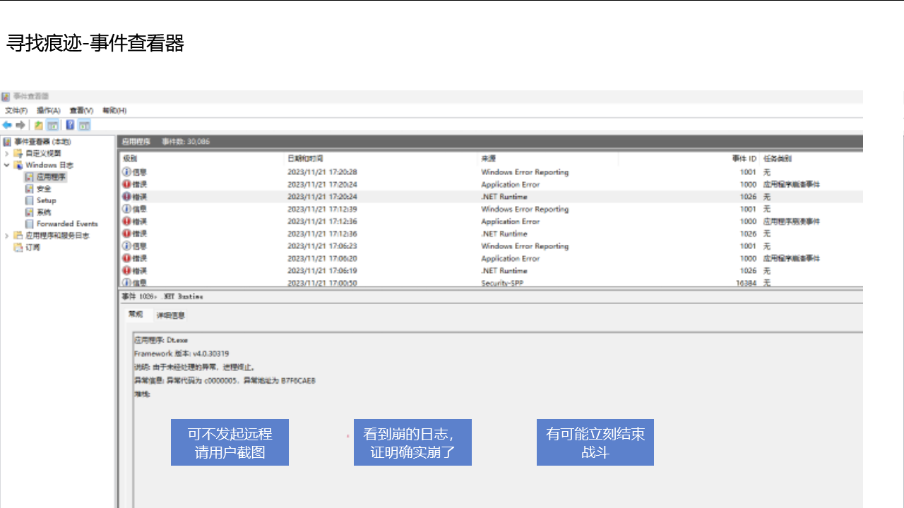 通过事件查看器可以进行快速的分析,如看到软件崩的日志,那就可以证明确实是软件崩溃了。后续咱的调查方向就可以向着软件崩掉的方向进行