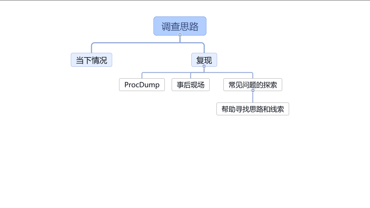 复现问题时,不仅只有 ProcDump 工具。还有可能面对的是事后现场的情况,此时需要使用更多的工具来辅助定位问题。以及当没有调查思路时,可以试试常见的问题的探索帮助寻找思路