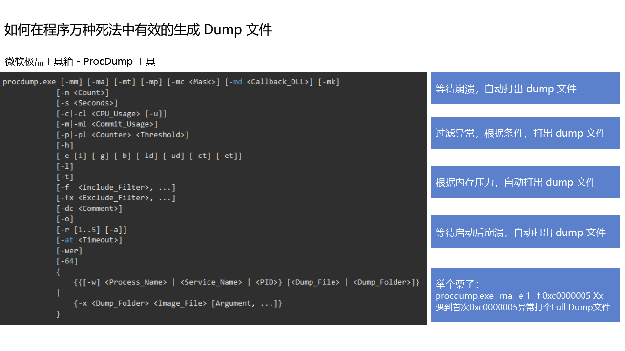 通过 ProcDump 可以在程序万种死法中有效的生成 Dump 文件,只需使用好 ProcDump 的参数。具体参数作用可以参考 微软官方文档 和 如何在 NET 程序万种死法中有效的生成 Dump (上) – 一线码农 – 博客园