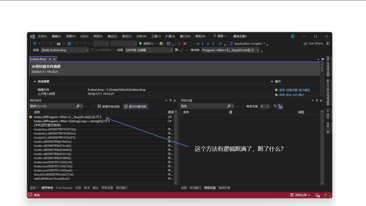 回顾一下,以上咱就聊了在用户端发现问题,先尝试使用 Windows 自带工具快速进行定位问题。以及捞到 DUMP 文件之后,如何在开发机器上通过 Visual Studio 进行进一步分析。分析的方法就是将 DUMP 文件拖入 Visual Studio 里面,然后点击混合调试按钮。等待 Visual Studio 自动分析,即可看到分析结果。分析的重点是调用堆栈、三板斧、局部变量。通过这三个方面的工具可以帮助我们进一步的分析问题