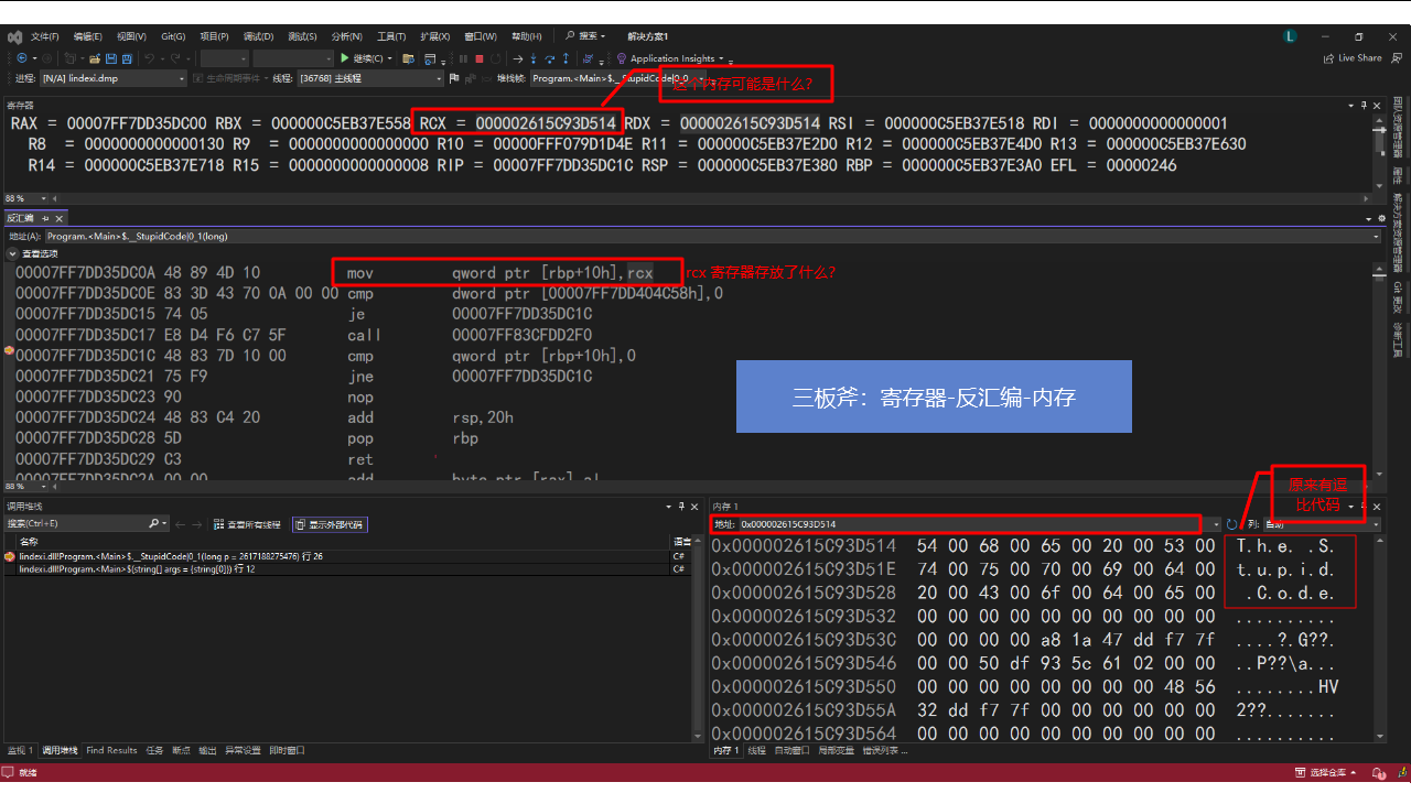 拿本课程的 CPU 爆高的例子,先通过反汇编发现了可能存在的问题,如想看看 rcx 寄存器里面存放了什么。通过寄存器窗格可以看到 rcx 寄存器里面存放了什么内容。通过内存窗格可以看到这个地址里面存放了什么内容。刚好就看到了对应的内存里面存放了一段逗比代码