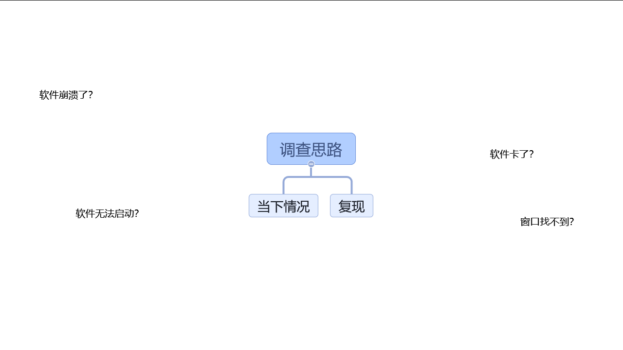 遇到用户说软件用不了的时候,咱可以有哪些入手点呢?我的调查思路是分为两个大的方向。第一个方向是从当下的情况入手。如果当下已经没有了现场了,则可以考虑第二个方向,复现(重现)问题