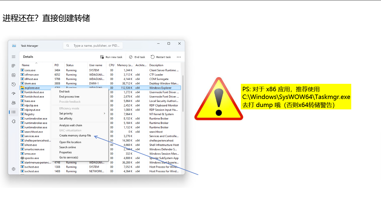 这里需要额外说明的是,如果当前系统是 x64 系统,但是自己的进程是 x86 进程,那此时不建议使用默认打开的任务管理器捞 DUMP 文件。因为默认打开的任务管理器是 x64 的,打出来的是 x64 转储文件,包含 WoW64 子系统的信息。详细请看 你生成的转储文件有问题吗? – 知乎