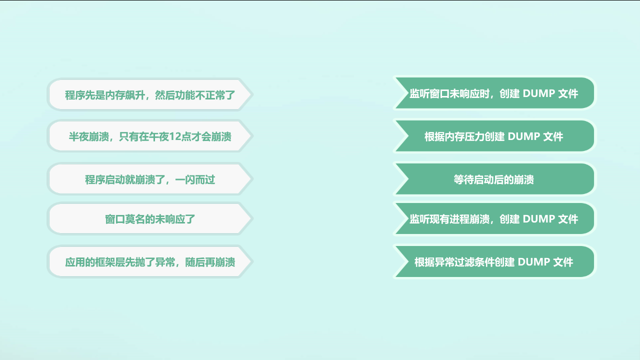 为什么说有时候不好使用任务管理器捞 DUMP 呢?因为现实往往很复杂。除了闪崩,软件启动即崩溃导致的手速不够快,捞不到 DUMP 文件之外,还有其他很多问题。比如软件就是处于似崩未崩的状态,期望抓到某个时机的状态,如软件一定会在某次 CPU 爆高之后不能符合预期工作,然而 CPU 爆高的时间非常短,靠人类去看去抓是有些废程序猿的。比如软件半夜崩溃,只有在午夜12点才会崩溃,这时候人类可能已经睡着了,即使没睡着,可能错过了这个时间点就要等明天的午夜12点了。再比如是非必现的问题,需要压测才能复现,期望自动化收集,否则可能要跑几千次才能复现一次,靠人类的工作量有些大