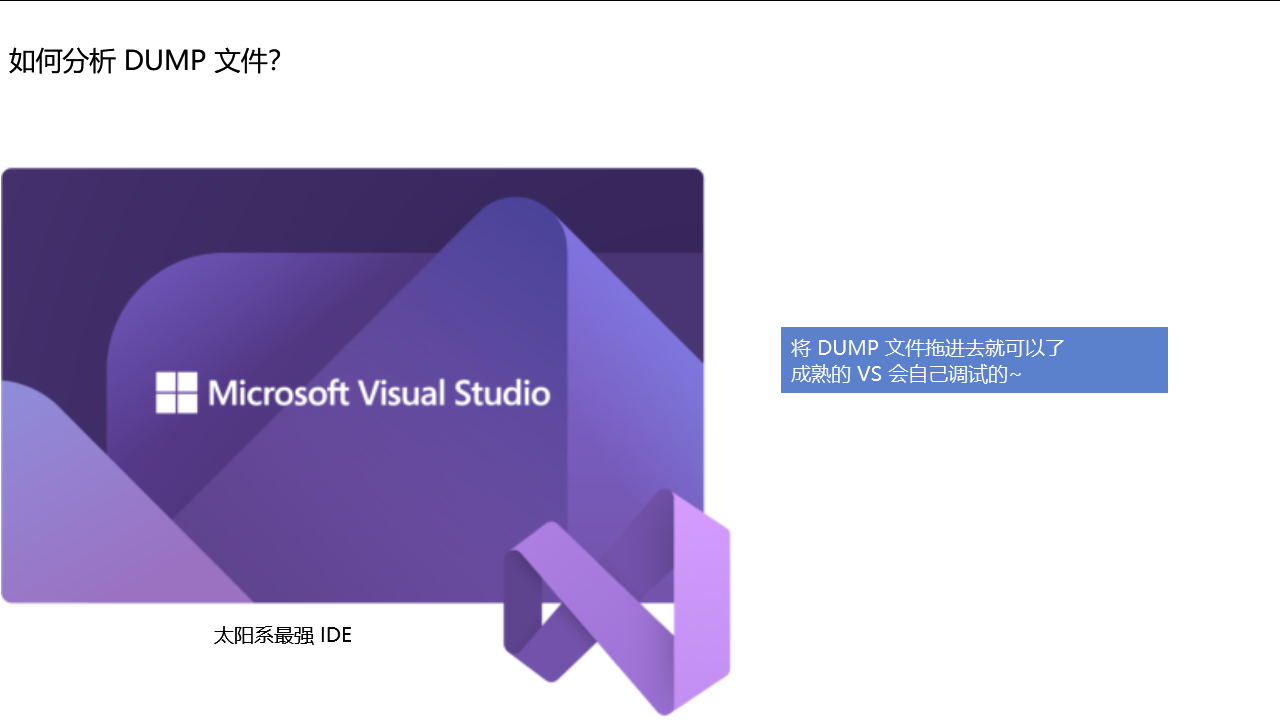 分析 DUMP 的工具有很多,我着重要和大家介绍的是太阳系最强 IDE —— VisualStudio。VisualStudio 已经是一个成熟的 IDE 了,只需将 DUMP 拖进去就可以了,聪明的 VisualStudio 可以自动帮咱进行分析