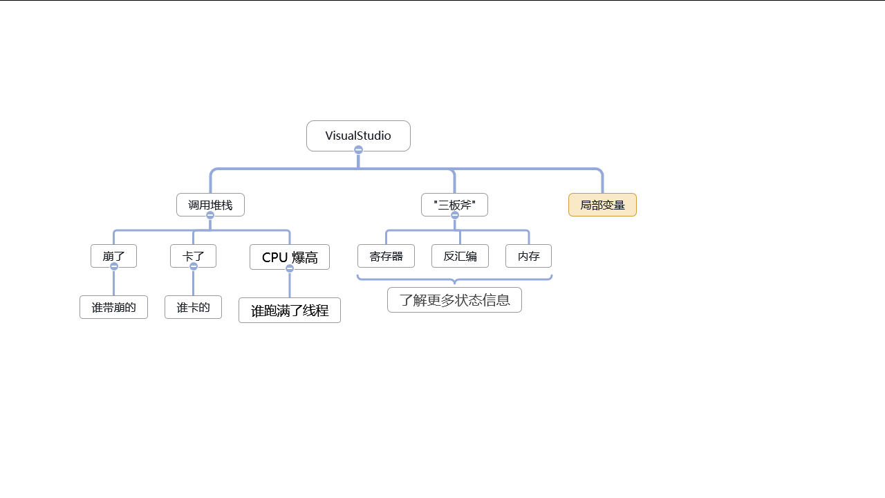 调用堆栈可以如何看?调用堆栈可以和着之前在用户端任务管理器所见内容进行一起分析。如在任务管理器看不见进程,即对应进程崩了的问题,可以通过调用堆栈尝试看到是谁带崩的,崩之前调用的是哪个函数。如果是在任务管理器能看到进程,但是 CPU 使用率不动,那可能是死锁问题,可以通过调用堆栈看到是哪个函数卡住了主线程或进入锁。如果是 CPU 使用率爆高,那可能是死循环问题,可以通过调用堆栈看到是哪个函数跑满了线程