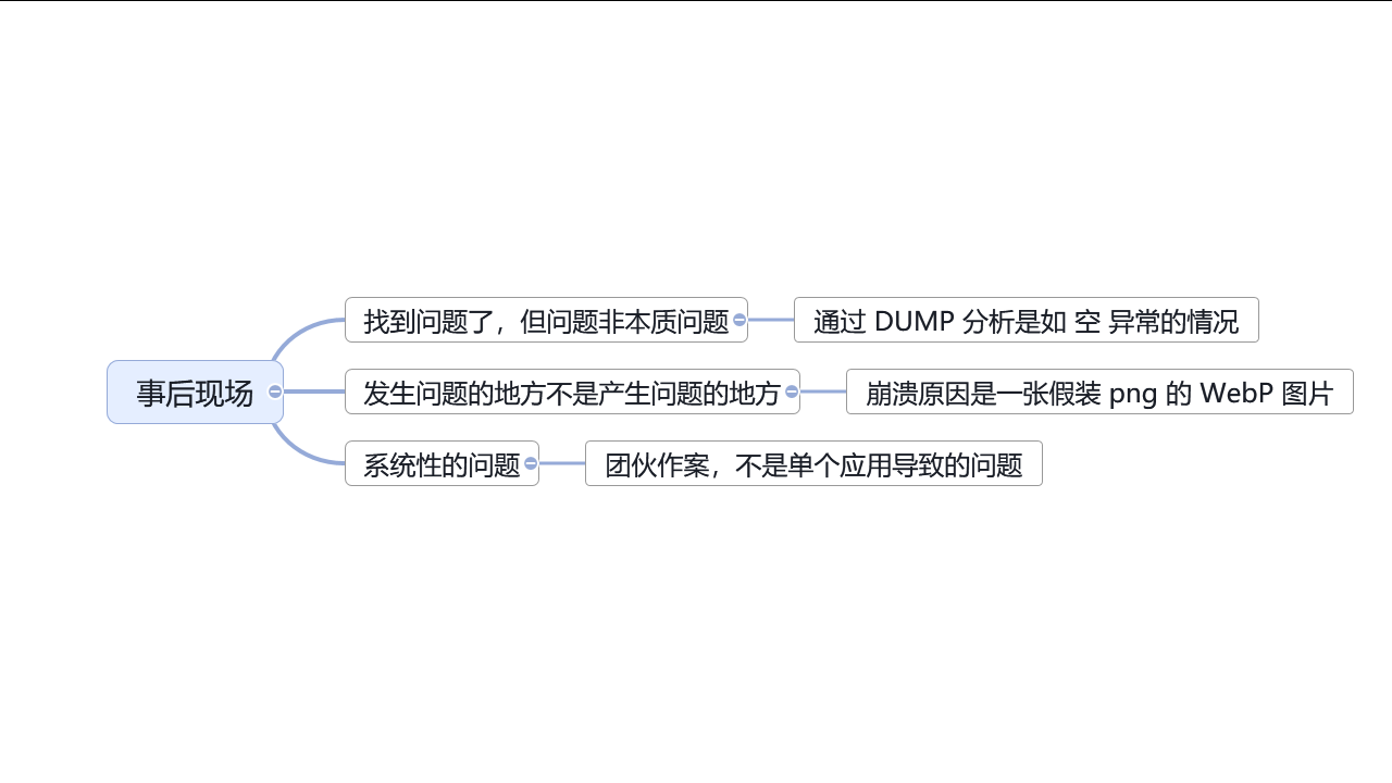 比如找到问题了,但问题非本质问题。常见的就是通过 DUMP 分析是如 空 异常的情况,导致崩溃的原因是因为空指针异常。但是空指针异常是如何产生的呢?这时候就需要通过事后现场分析思路调查来进一步分析问题