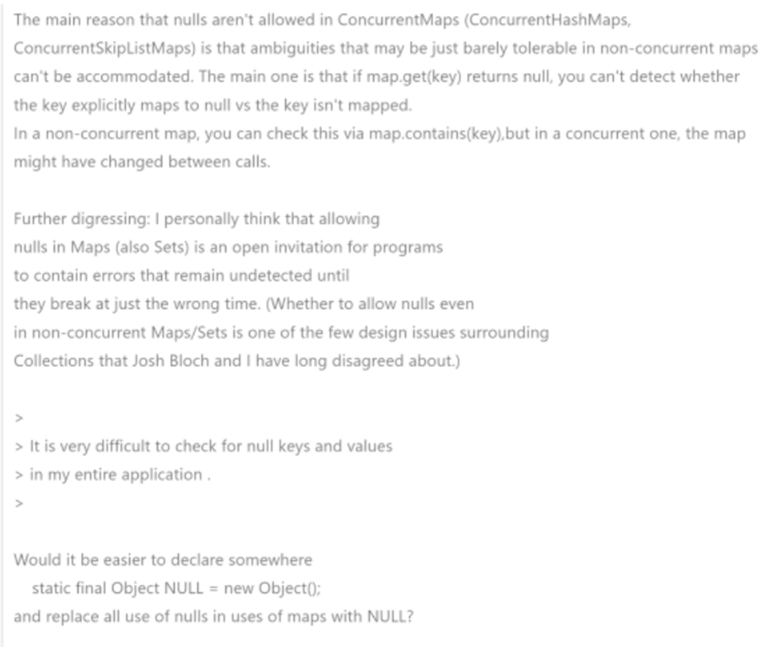 但是,像ConcurrentHashMap,它是为并发而生的,它是要用在并发场景中的,当我们map.get(key)返回null的时候,是没办法通过map.contains(key)(ConcurrentHashMap有这个方法,但不可靠)检查来准确的检测,因为在检测过程中可能会被其他线程锁修改,而导致检测结果并不可靠。