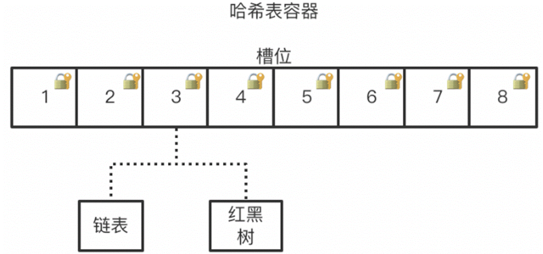 如何高效的执行并发操作:根据上面hashMap的数据结构可以直观的看到,如果以整个容器为一个资源进行锁定,那么就变为了串行操作。而根据hash表的特性,具有冲突的操作只会出现在同一槽位,而与其它槽位的操作互不影响。基于此种判断,那么就可以将资源锁粒度缩小到槽位上,这样热点一分散,冲突的概率就大大降低,并发性能就能得到很好的增强。