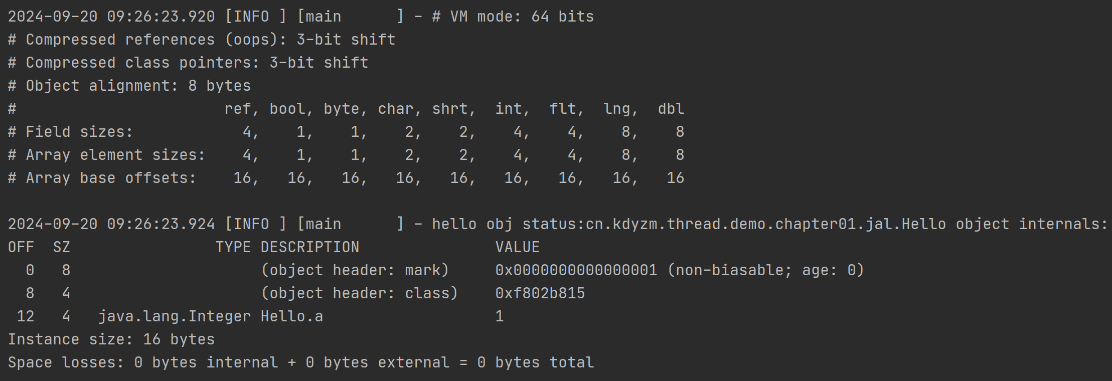 log.info("hello obj status:{}", ClassLayout.parseInstance(hello).toPrintable());