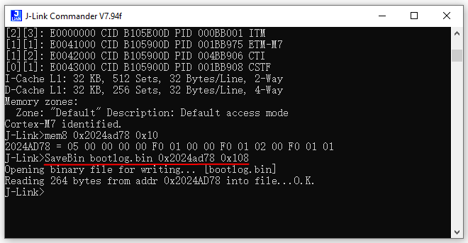 以 i.MXRT1170 为例,痞子衡找了一块开发板,上电后挂上 J-Link 调试器,使用 J-Link 命令行工具里的 SaveBin 命令从 0x2024ad78 地址处读取最大的日志数据存储到 bootlog.bin 文件中。这里需要注意在用 J-Link 连接目标设备时尽量不要选 MCU 型号,而用内核 CORTEX-M7 代替,这样可以防止选了 MCU 型号而自动加载执行相应配套初始化脚本(万一脚本里有片内 RAM 相关操作破坏日志数据)。