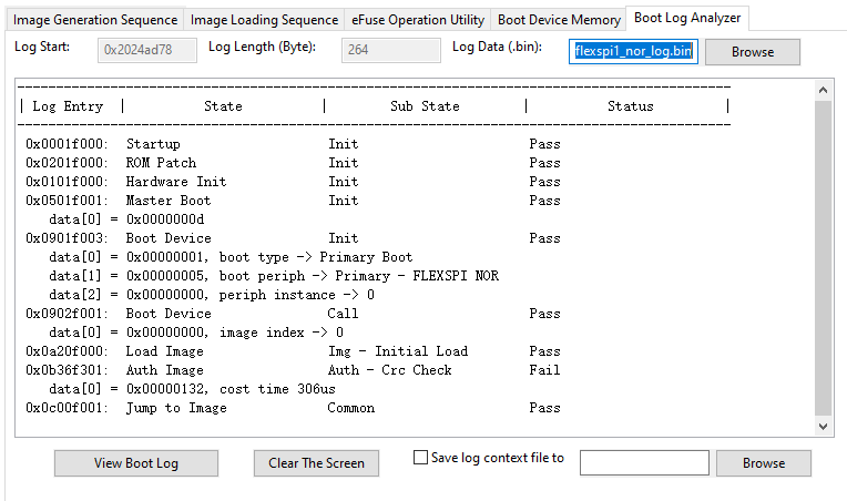 还是继续以 i.MXRT1170 为例查看解析后的日志结果,我们在 FlexSPI1 连接的串行 NOR Flash 里下载一个能正常启动的 XIP 裸用户程序(非签名非加密),将芯片启动模式设为 2’b10,当看到程序正常执行后,挂上调试器读出启动日志数据(确保日志未被用户程序),并用 MCUBootUtility 软件解析如下,还是能够清晰地看到 ROM 执行过程信息的。