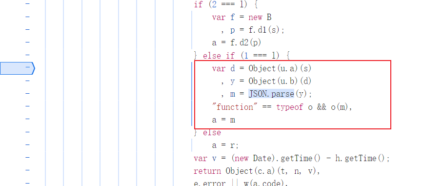 地方比较多,需要进行筛选。如果JSON.parse是该函数的第一行代码就铁定不是,因为是需要先解密再进行JSON解析的。点击几个,发现了一处跟加密逻辑很像的代码。(其实一般情况下加密逻辑和解密逻辑是写在一起的)