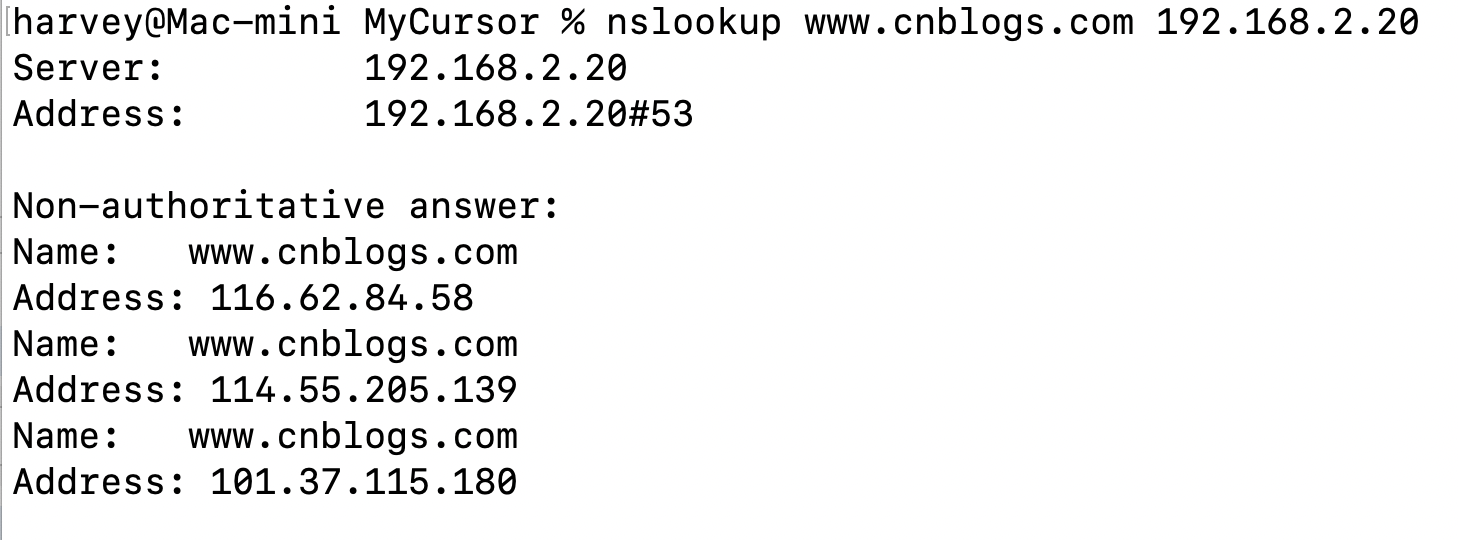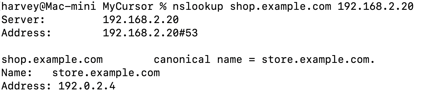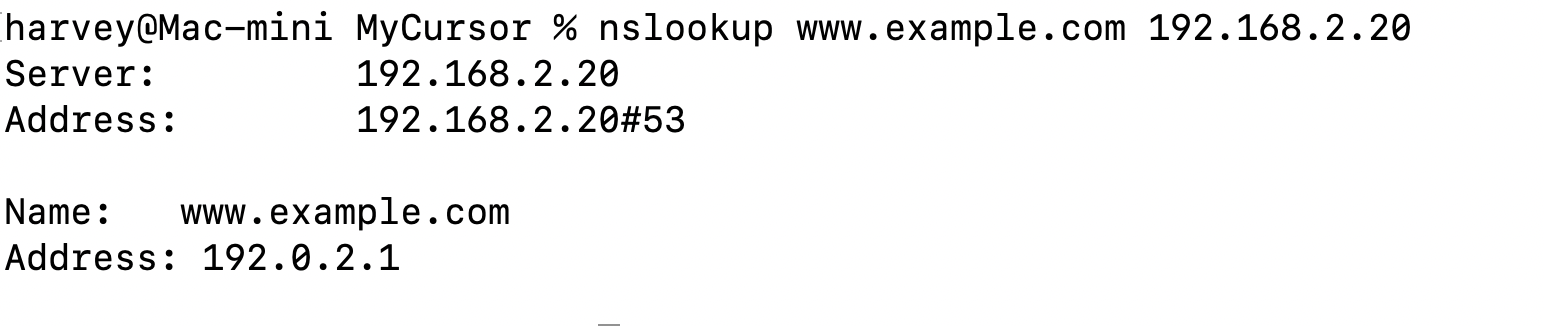 按照配置文件dns_config.txt中的配置www.example.com A 192.0.2.1 应该查询的结果为192.0.2.1才符合预期,我们来试试