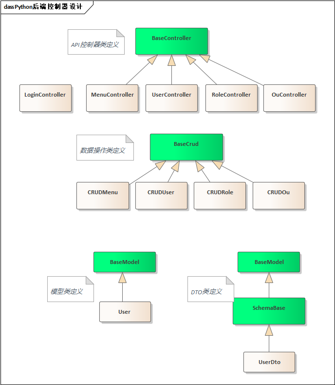 即使按照分层逻辑的划分,我们对于每个分层中的对象,我们都应该尽量减少重复编码,因此使用Python的继承关系来抽象一些通用的属性或者接口及实现等,以便实现更加高效的开发,减少冗余代码。