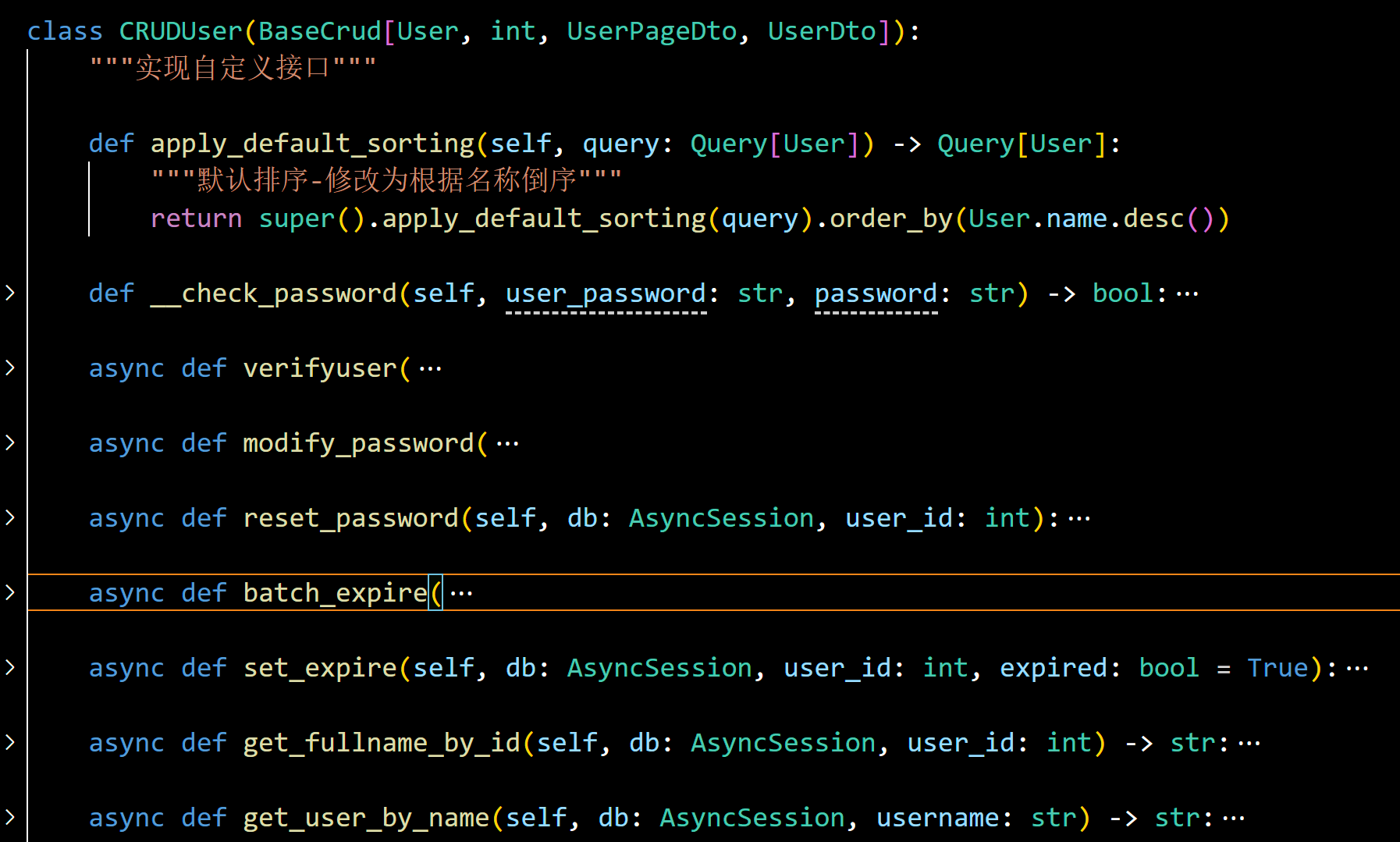 class CRUDUser(BaseCrud[User, int, UserPageDto, UserDto]): """实现自定义接口""" def apply_default_sorting(self, query: Query[User]) -> Query[User]: """默认排序-修改为根据名称倒序""" return super().apply_default_sorting(query).order_by(User.name.desc())