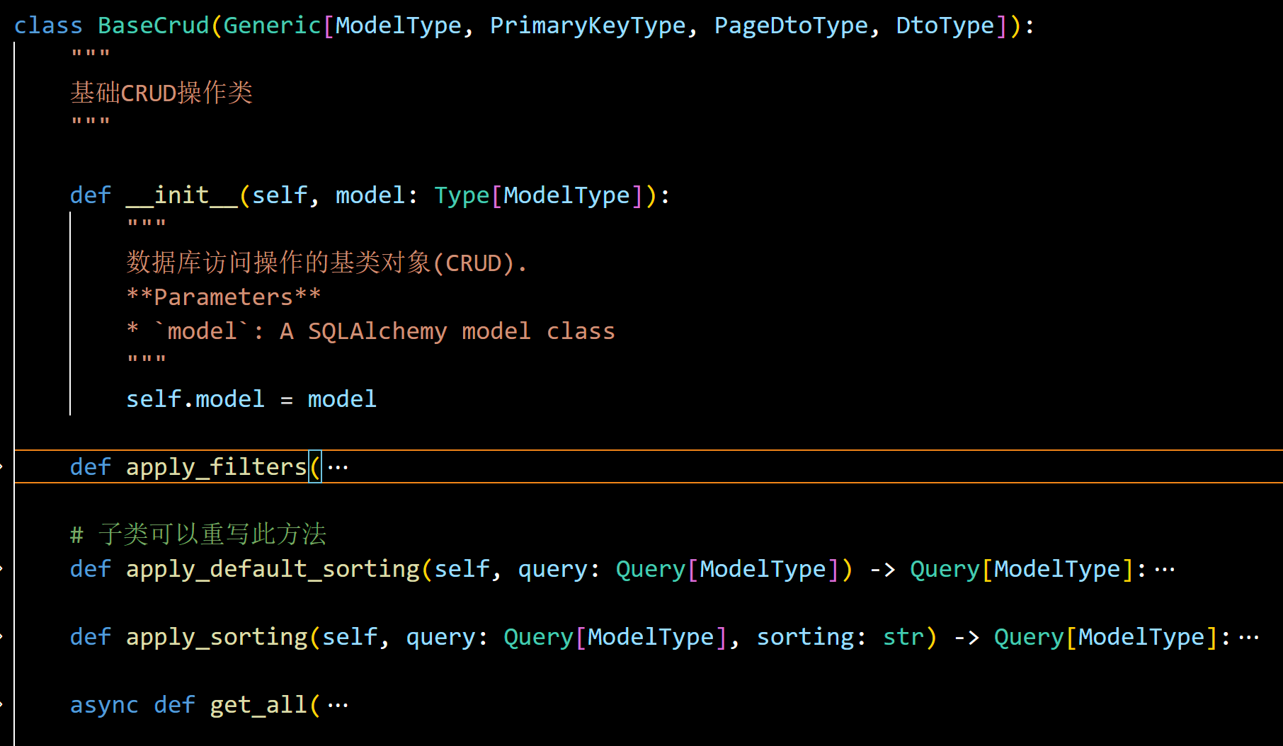 在具体化一个Crud子类定义的时候,我们可以传入对应定义的模型类、主键类型、分页查询对象、常规DTO交互对象等信息进行处理,如果我们需要改变排序规则,重写 apply_default_sorting 函数即可。