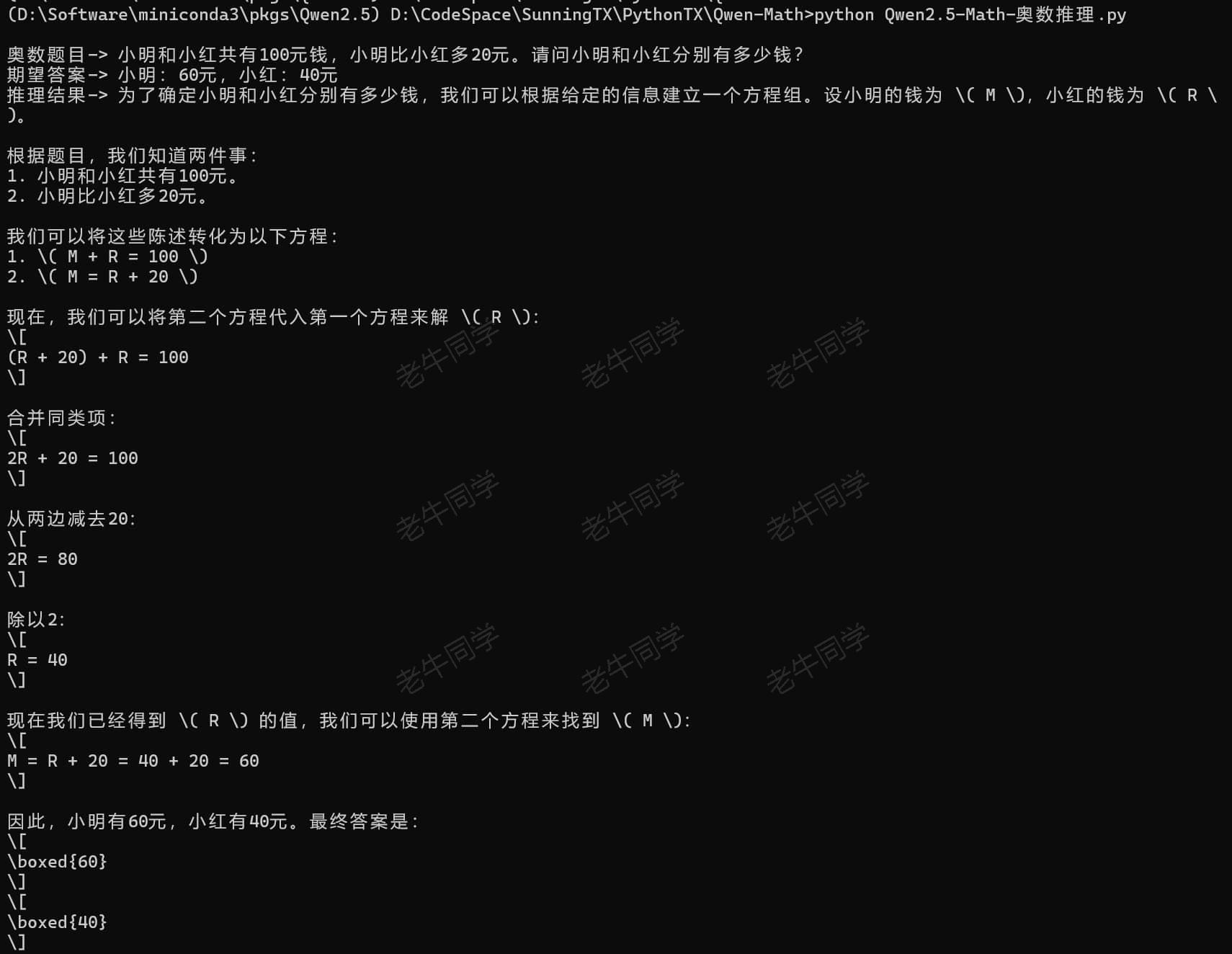 从最终结果来看,Qwen2.5-Math 推理过程很清晰,和我们的思维模型比较相近(唯一不足就是老牛同学电脑配置有点吃力)。