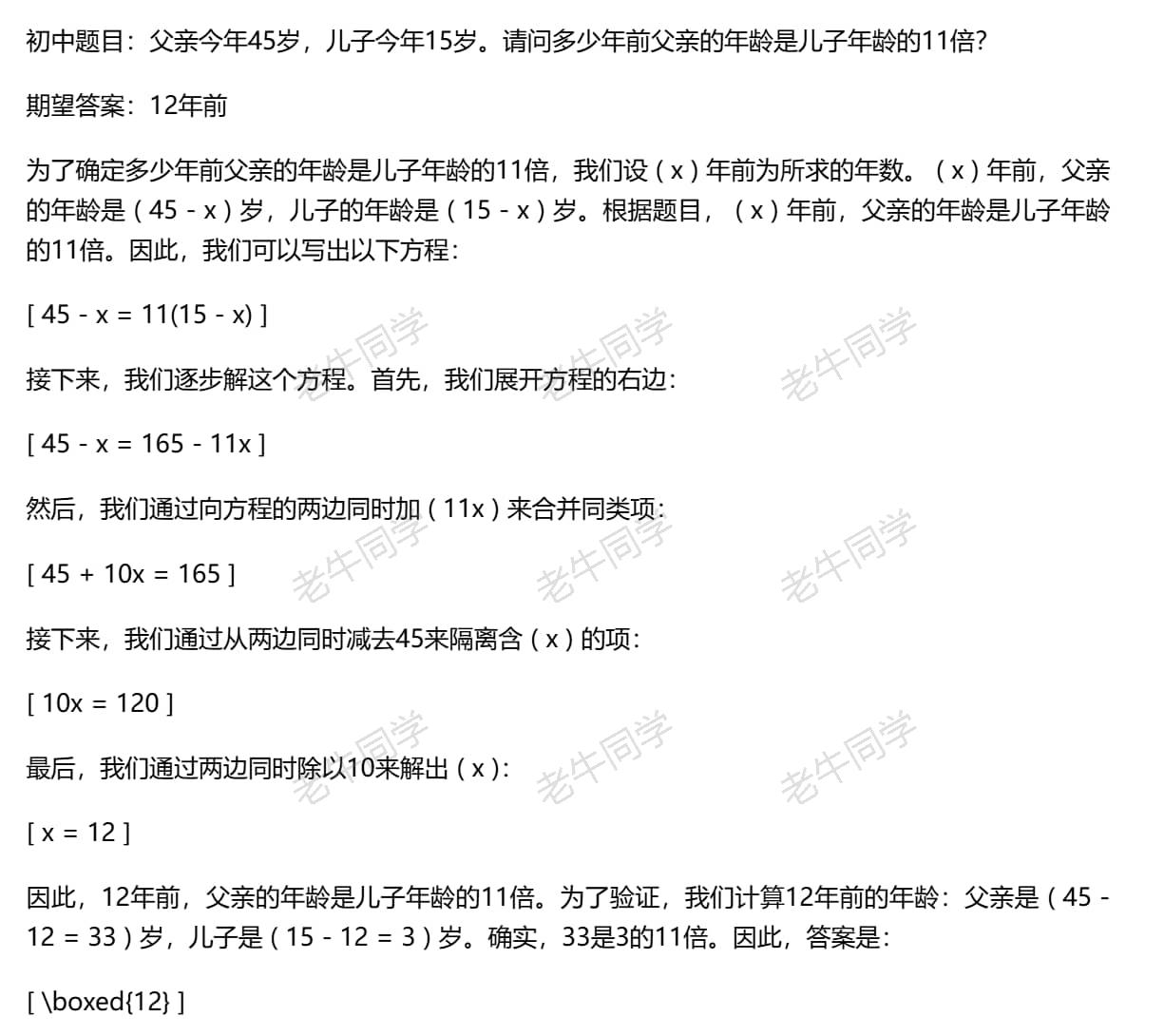 "title": "父亲今年45岁,儿子今年15岁。请问多少年前父亲的年龄是儿子年龄的11倍?",