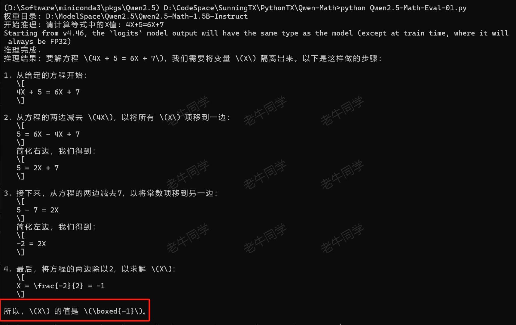 我们先通过一个简单数学方程:4X+5=6X+7,验证一下 Qwen2.5-Math 的推理能力: