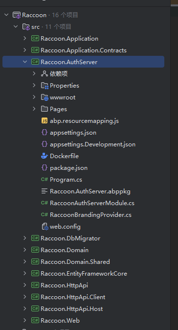 然后我们打开创建的解决方案Raccoon.sln,然后我们又看到了熟悉的目录结构了。